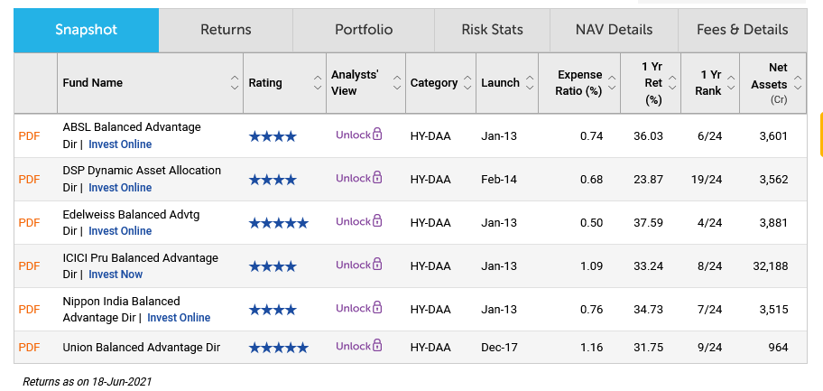 To check the returns of balanced advantage funds over these periods, I used a free tool by Value Research – Point-to-Point Returns.