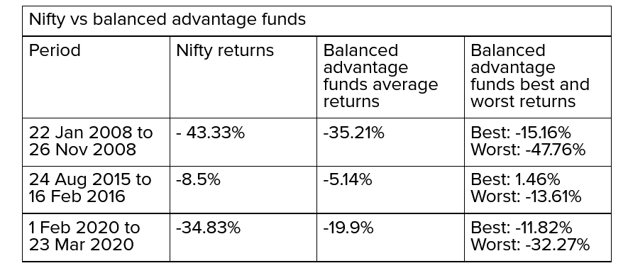 So, does this strategy work? Well, when things are going well, most funds will do well. No need to look there. But the primary selling point of balanced advantage funds is that they will protect your money in the event of market crashes. Have these funds been able to do that?